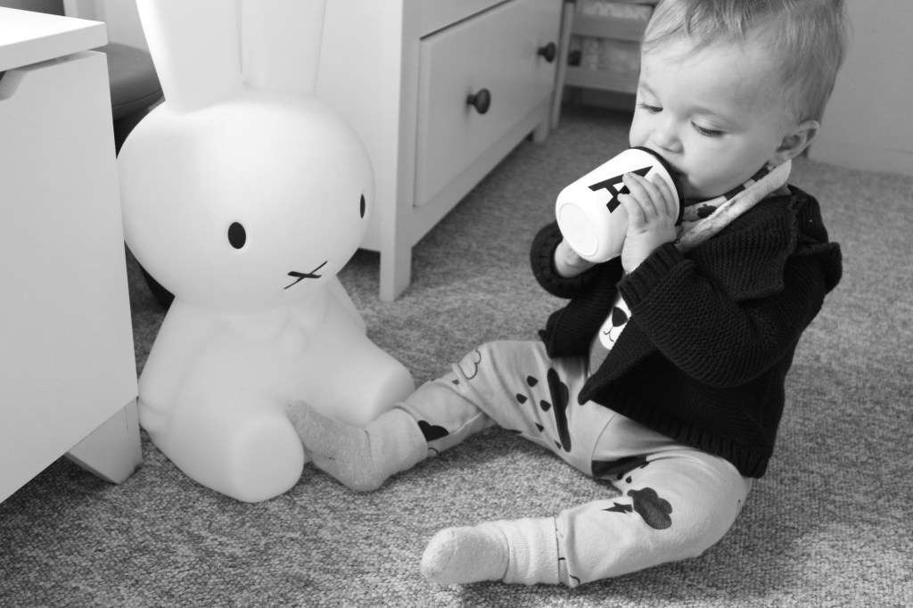 Bab drinks from the Design Letters cup and plays with the Mr Maria Miffy lamp, both from Olive Loves Alfie