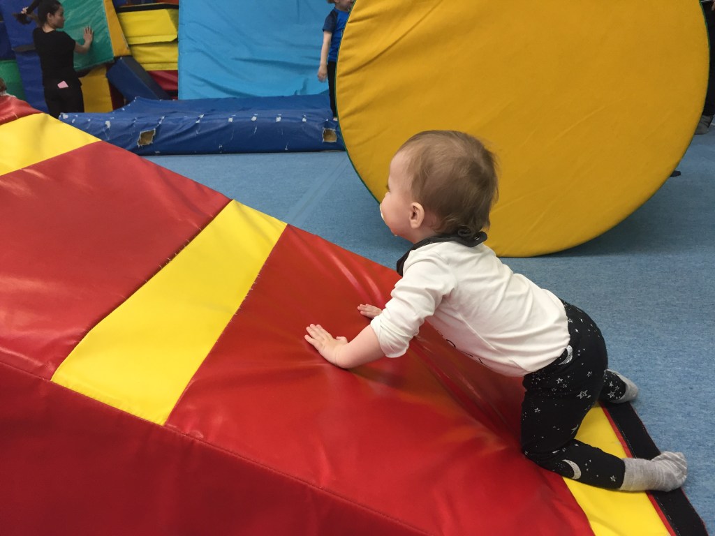 One half of the gym is set up with balance beams and trapeze things for more adventurous toddlers, while the other half is a big squashy baby paradise with soft slides and tunnels in primary colours and very little capacity for injury – though Bab tried her best. There were staff floating around in case of disaster but thankfully there was no forced fun and no PE teachers.