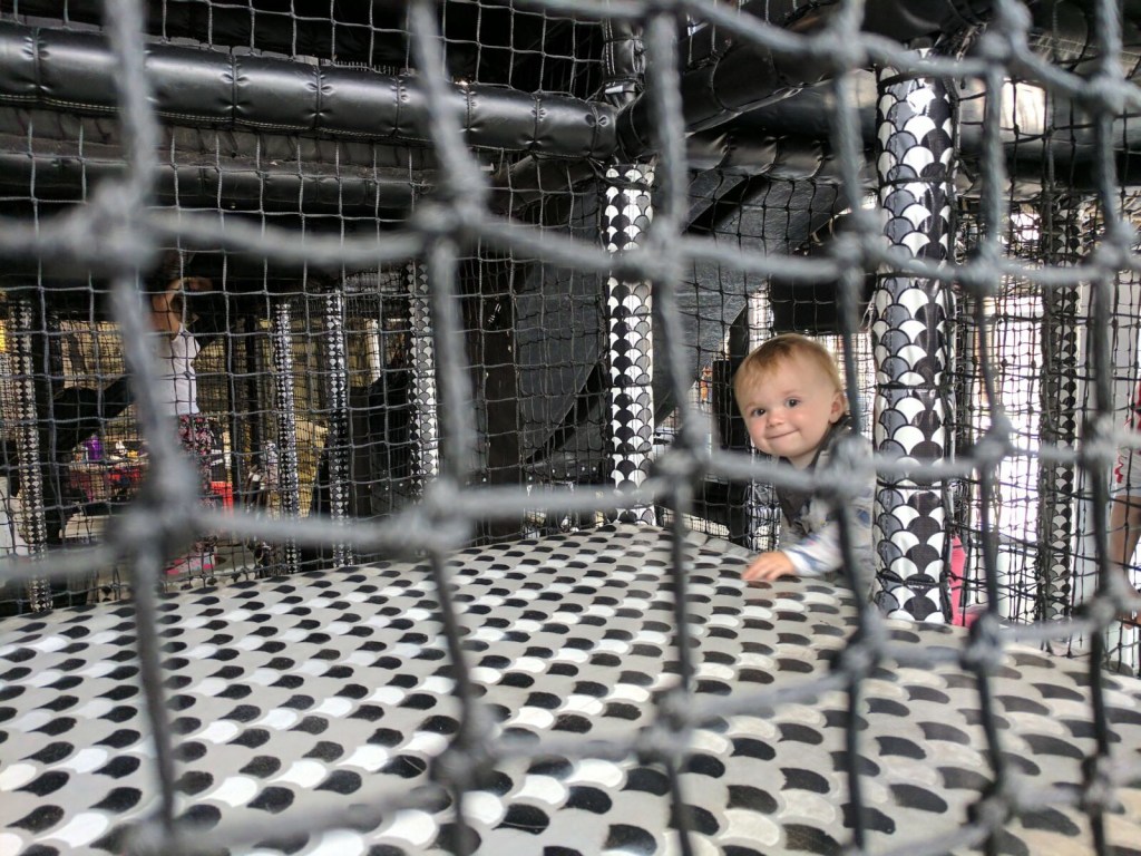 The result, however, far from freaky and daunting, is fun and refreshing. Bab was too little for the main play area – a labyrinthine network of mesh climbing walls, steps, slides and drop-holes – but was happy enough in the black-and-white ball pool. She also loved the smaller toddler slide, despite me having to take her down it on my knee after our attempt at launching her down by herself resulted in head injury. We are dreadful parents.