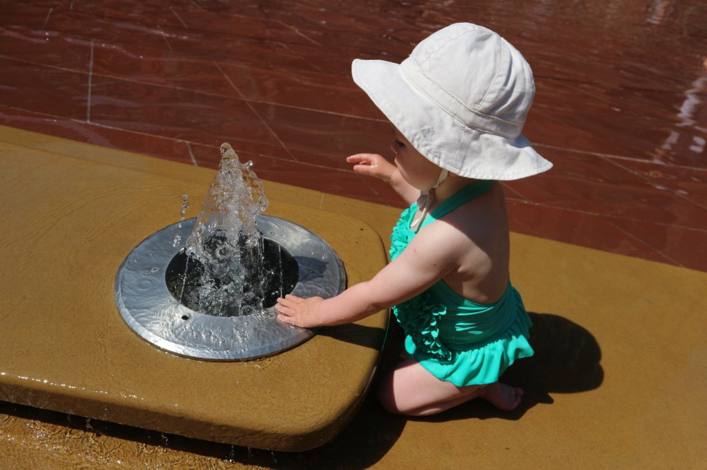 Bab plays with the water feature in the courtyard approximately 2.5 seconds before she rolls into the paddling pool and smashes her face on a stone slab at the V&A, South Kensington