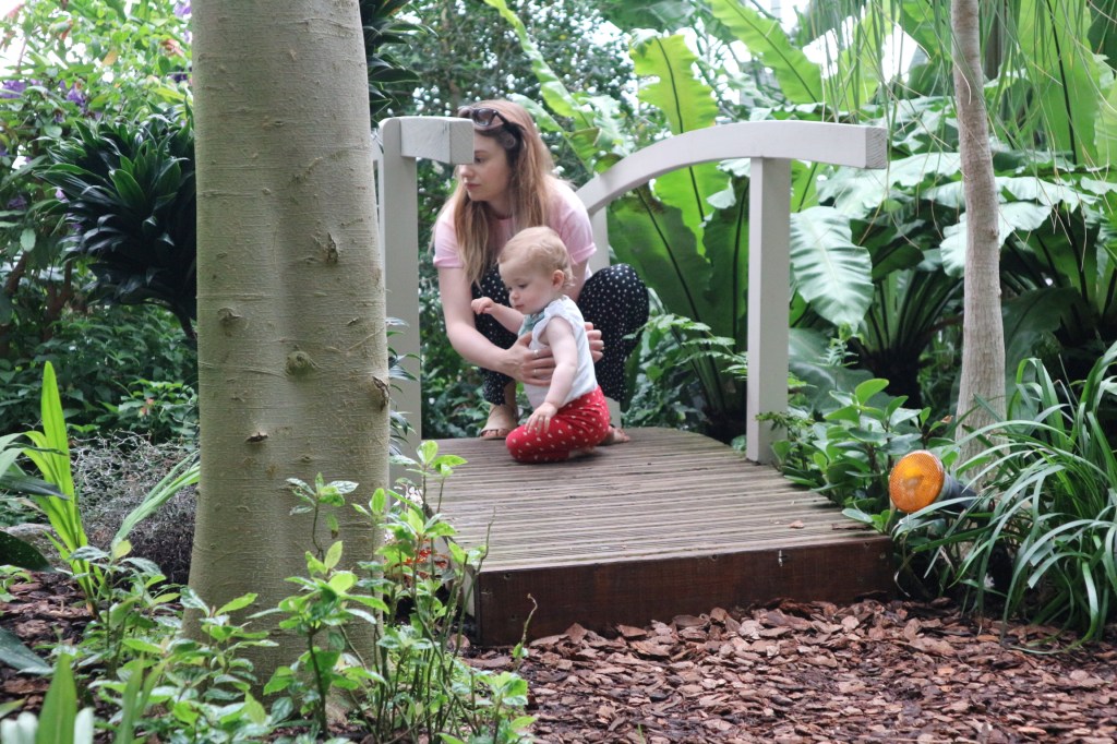 Bab tackles the lily-pond bridge aided by mummy because she can’t be trusted where water is concerned, at the Barbican Conservatory
