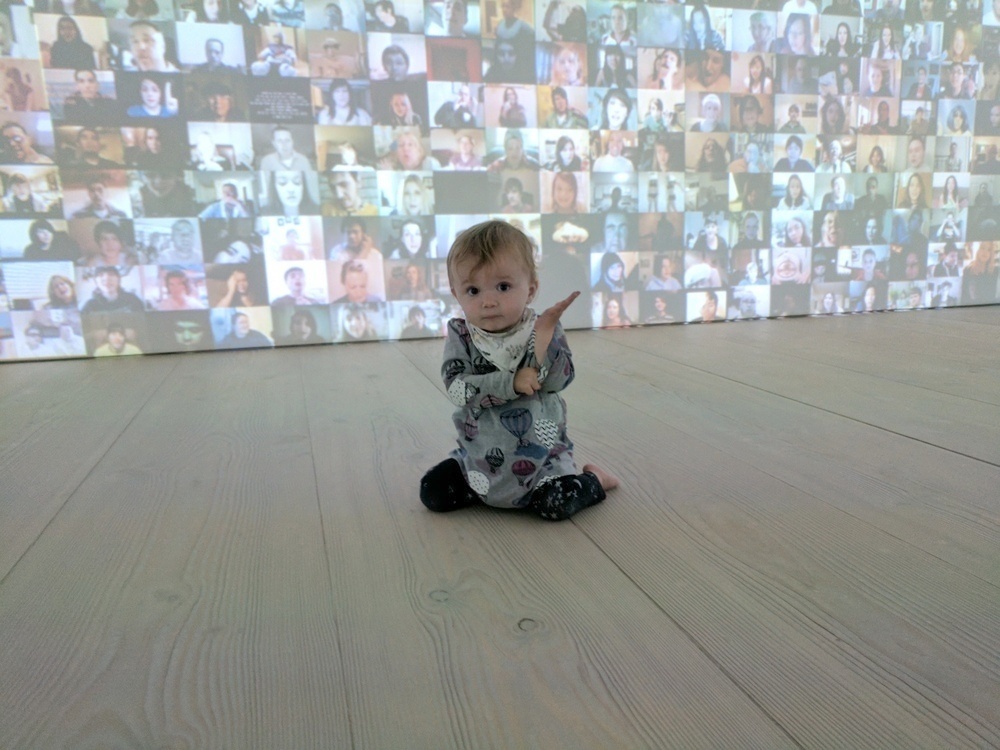 In the first gallery, famous introspective works by influential artists including Rembrandt, Picasso, Van Gogh and Munch are displayed on digital screens and can be ‘liked’ by visitors using connected smart phones, with likes displayed Instagram-style next to the digital portrait. I didn’t bother trying to interest Bab in this activity as she was being dreadful and wouldn’t let me hold her, but at the very least most of the screens were hung high enough that I could let her writhe around the gallery floor without having to worry about her ripping them out of the wall – that was until one of the gallery assistants warned us against it since they hold functions in there and there’s “often broken glass on the floor”.