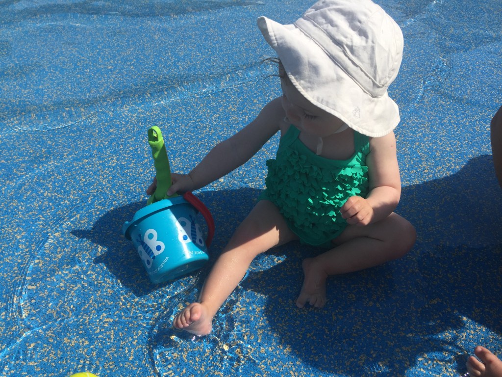 Bab plays with a bucket and spade stolen from a screaming child in the paddling pool, Hampstead Heath