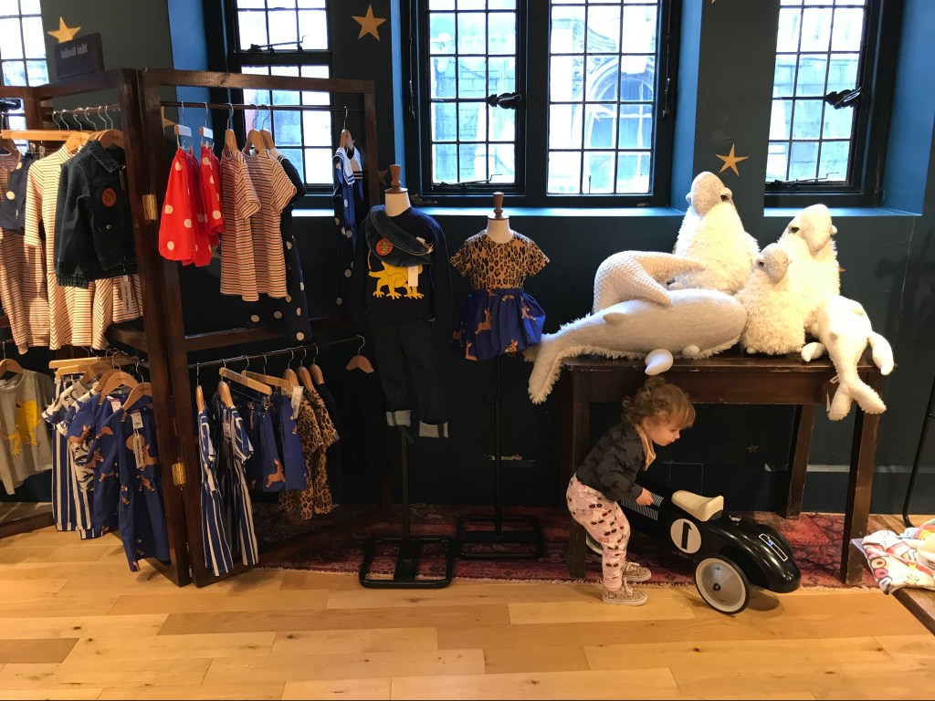 The thing that particularly impressed me about Little Liberty though wasn’t the choice of prints, the well-curated brand selection or the way it had all been elegantly arranged to resemble the bedroom of London’s jammiest child, but how ridiculously – and unexpectedly – child-friendly it all was. Everything was free to be played with, from the horses both rocking and hobby to the books that were displayed alongside their very own cosy reading chair. Gone was the familiar presence of the unsubtle security guard pretending not to eyeball us while we browsed, and the friendly saleswoman didn’t even bat an eyelid when Bab decided it would be fun to empty the entire Bobo Choses rail and hand her the contents piece by piece. All in all this was a really lovely shopping experience (made even better by the fact that I managed to resist spending any money), and a surprisingly good tantrum-diffuser on a Central London shopping trip that was otherwise predictably miserable.