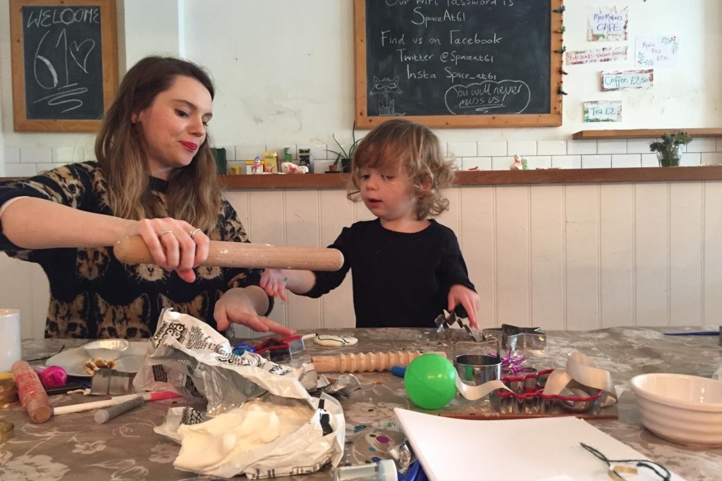 Anyway, do you know what? It was really good. The space is basic but there’s everything you need, from a small cafe area to baby-changing and a play zone, and enough space to accommodate 15-or-so toddlers and their adults. It was a couple of weeks before Christmas so we made tree decorations from air-drying clay and those press-on jewel things, and ate mince pies (not free but pretty cheap) while we worked. On another table there was fingerprint-reindeer gift-tag making, which was cute but I wasn’t sure how much my loved ones would appreciate gifts labelled with tags that had seemingly been smeared with poo, so we gave that one a miss and resorted to the toy and book corner once Babu had tired of cutting out clay stars and rolling them in glitter.