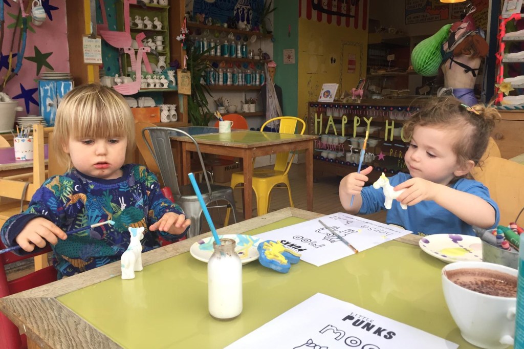 The best thing about it, in my opinion, is it’s parent-led (or, let’s be real, toddler-led). You simply rock up sometime between 12 and 3, ask for the Little Punks package and a member of staff will bring you a book to read (ours was Mr. Brown Can Moo! Can You? by Dr. Seuss), a related colouring sheet and mini ceramic, plus a hot drink of your choice, a babyccino and the tiniest, least-doughnutty-tasting (but still really good) doughnut you’ve ever had in your life. The second-best thing about it is that Punk Me Up isn’t all about the ceramics; so when your two year old inevitably tires of blobbing a puke-coloured hue of their own creation onto a small clay horse, he or she can get stuck into the toy box or the dressing-up cupboard instead.