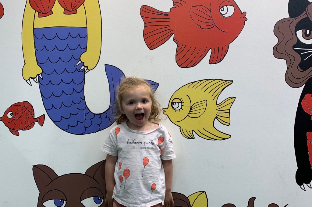Babu poses in front of the mermaid cat wall at Mini Rodini, Notting Hill.