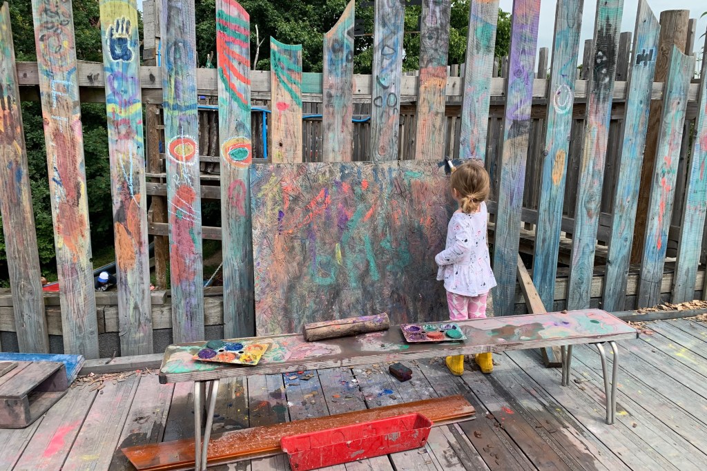 Next Babu decided she wanted to go down the giant tunnel slide, but couldn’t fathom how the approach to it could be on the other side of the playground. In fact the slope up to the slide is on such a gentle incline it snakes around almost the entirety of the playground, with a lovely peaceful little painting station positioned halfway round (you’re free to paint the actual wooden structure of the climbing frame if you’re so inclined). Some people dragged squares of carpet up the slide to cushion their fall, but Babu preferred to make a weird sawing noise as she slid across the ridged surface (it seemed to be made out of an underground water pipe) than enjoy a comfortable ride.