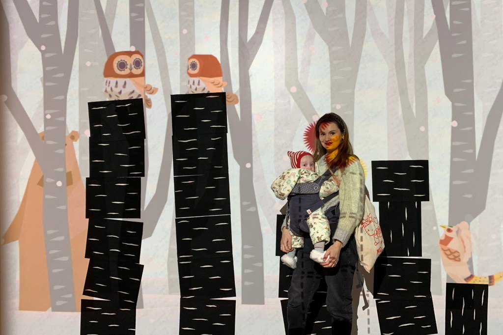 Mummy and Ro-Ro play with the POPPO Woods interactive display at WOW: City Lights & Woodland Shade at Japan House.