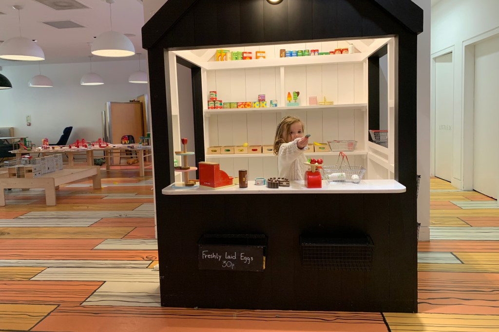 If you do fancy a quiet moment though, the Imaginarium’s your best bet. The first room you come to when you pass through the club’s glass doors and past the hypnotic fish tank in the entrance hall, this vast space packs in plenty to occupy little ones, as well as offering adults a comfy ringside seat where they can grab a coffee and a minute to themselves whilst keeping an eye on the kids. Here you’ll find Liquorice Allsort mini soft play and play tables dripping with train sets and construction toys, a kids’ library packed with with ‘Little People, Big Dreams’ titles, and a huge, cushion-filled chillout pod suspended from the centre of the space to read them in. There’s a superhero dress-up area decorated with comic-strip wallpaper, desk-mounted tablets loaded with fun yet educational games, a home corner where they can catch up on the housework, and a beautiful playhouse that’s set up as a grocer’s. I kept thinking that a play cafe half the size of this room with even half the facilities would be amazing, but the Imaginarium is just a tiny portion of the PD offer.