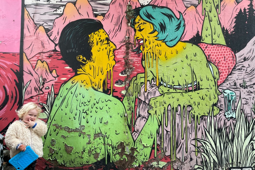 Roma checks out a mural by Israeli graffiti collective Broken Fingaz on Wilmer Gardens, Hoxton.