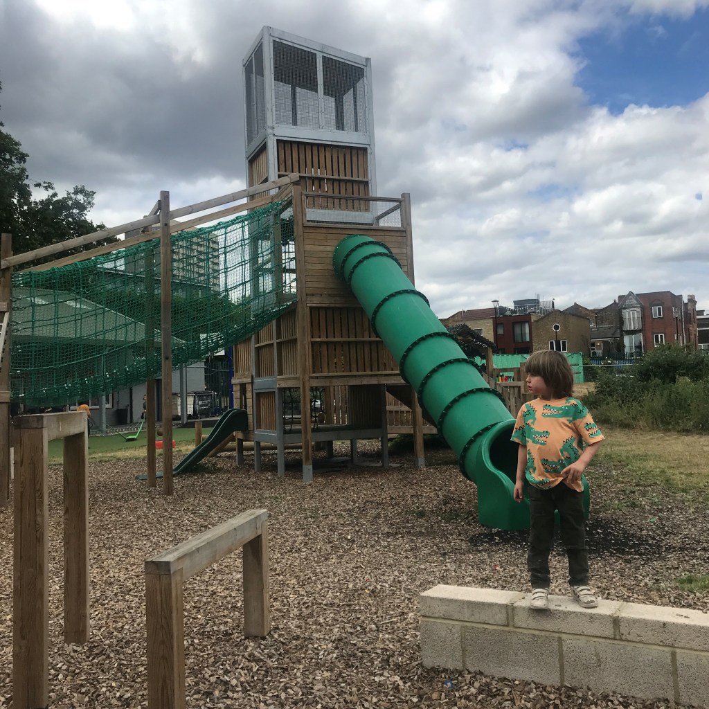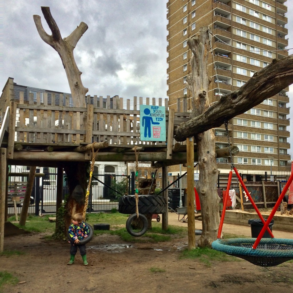 This playground is actually part of a children’s centre and runs sessions for under-5s (which cost a couple of quid). The big structure has sloped access and features an exhilaratingly fast tunnel slide that launches you into a pile of crash mats and makes you feel like your brain’s been sucked out. Lots to climb and plenty of pallets and boards forming bridges and towers to jump off. We were always astounded by the amount of materials and messy-play activities packed into every inch of the playground. A toddler paradise.